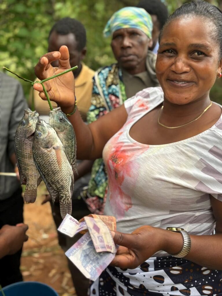 A farmer with fish harvested from their group fish pond at Itambo village-Njombe region.