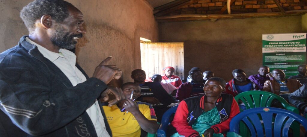 MR.Chawe ,a farmer from Matamba village elaborating to his fellow farmers about climate risks and hazards at his village during building resilience workshop organized by NADO.
