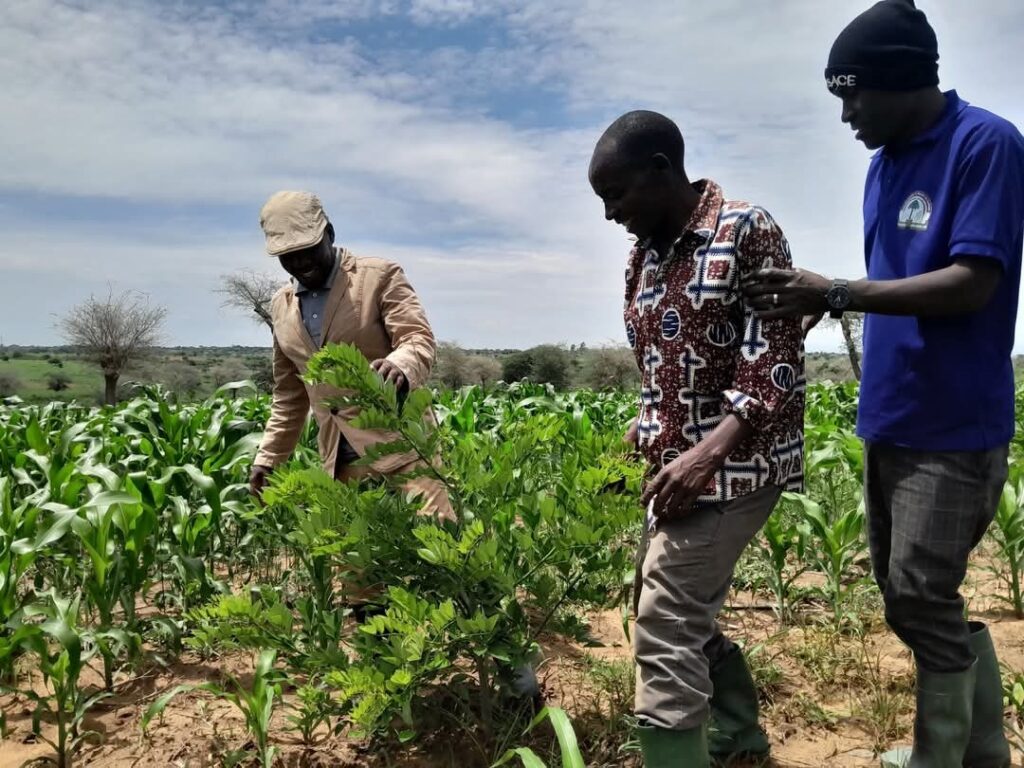A farmer at the middle with NADO staff at his farm applied with agroforestry system. A tree is grilicidia sepium , which is good for soil conservation