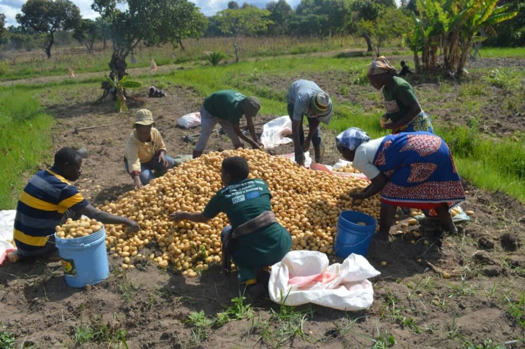 NADO staff with farmers sorting potatoes during capacity building on Post harvest handling practices (sorting, cleaning, grading, packaging and storing) at Sakalenga village in Wanging’ombe District -Njombe region